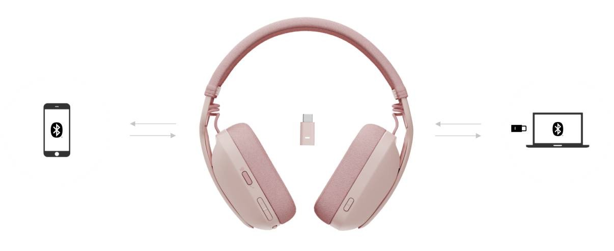 Zone Vibe Wireless permiten una conexión potente entre los auriculares y la laptop a través del receptor USB-C y hasta 18 horas de tiempo de conversación2La duración de la batería puede variar según las condiciones ambientales y de los dispositivos entre cargas. El Bluetooth multipunto cambia fácilmente entre dispositivos para evitar llamadas perdidas.