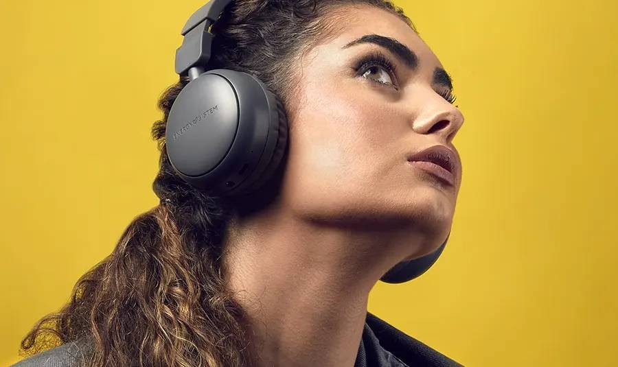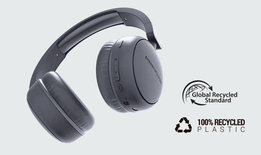 Audífonos inalámbricos de diadema fabricados con plástico 100% reciclado, con certificación GRS. Los materiales utilizados en el packaging son también sostenibles y respetuosos con el medio ambiente (certificación FSC). ¡Di hola a música sostenible!